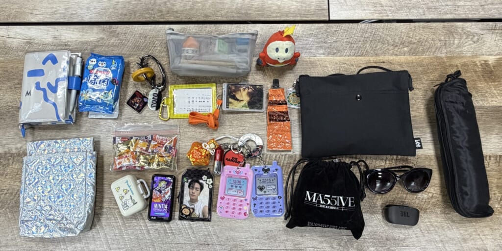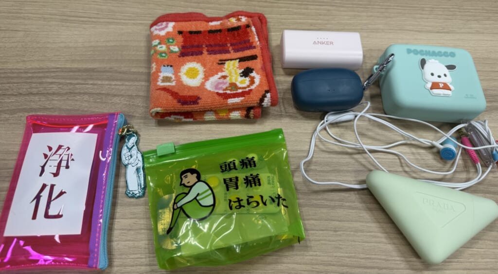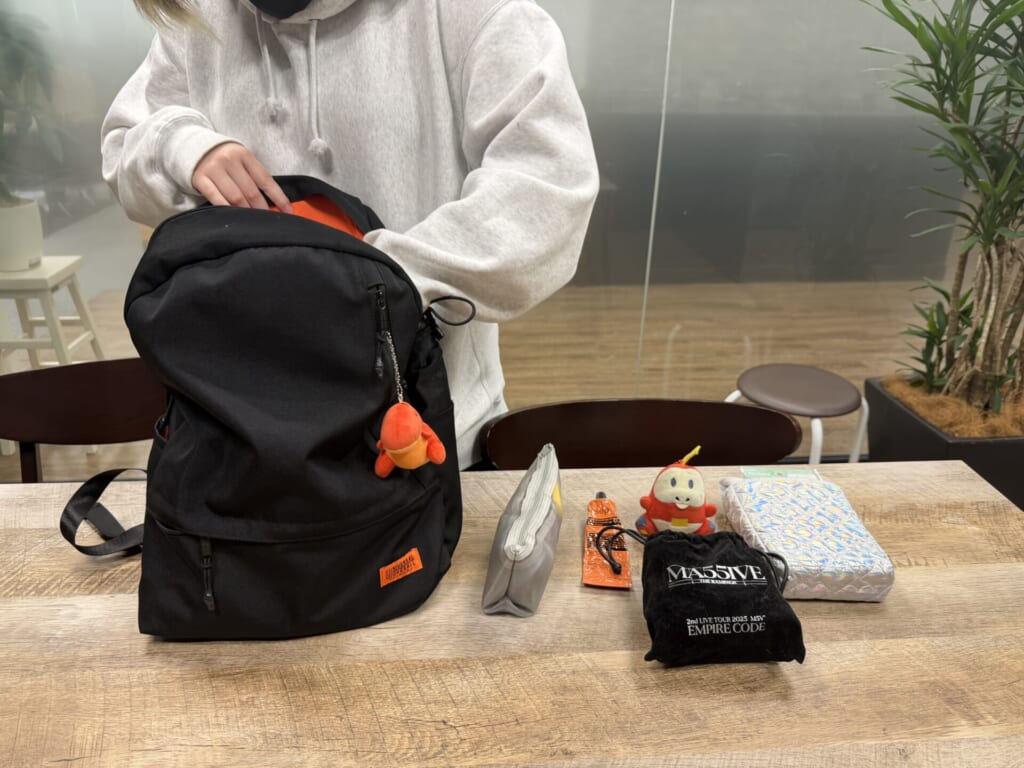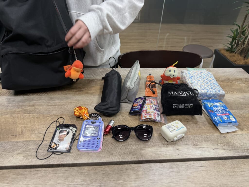 ぬいぐるみだけでなく、ひとつひとつ「好きなアーティストのライブグッズで」「これは今年の初詣のときに買ったお守りで」「薬を入れているケースも気に入っていて」と説明してくれ、すべての持ち物に愛着があるということが伝わってきました。