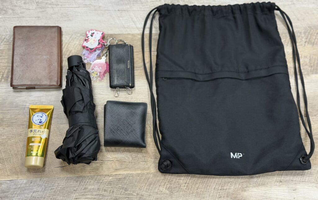 Kさんのカバンはジムサック。「身軽で素早いほうがかっこよくないですか、アサシンみたいで」という言葉とともに並べられたカバンの中身は……、なんとわずか5点!