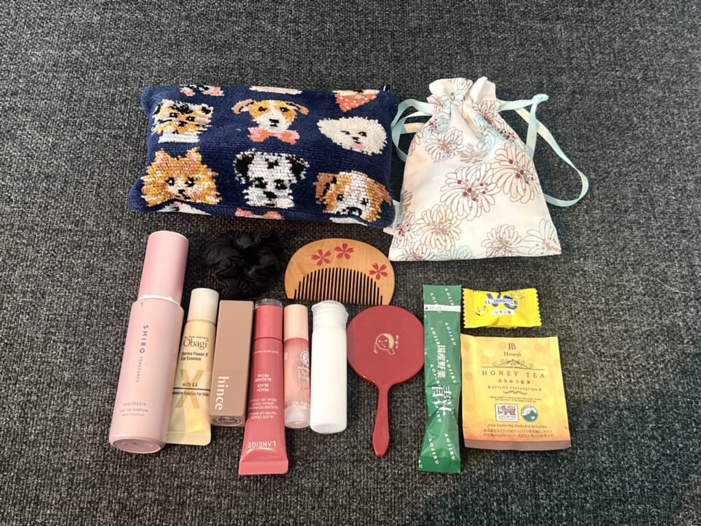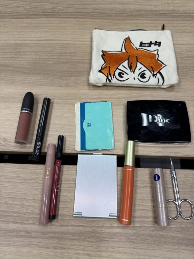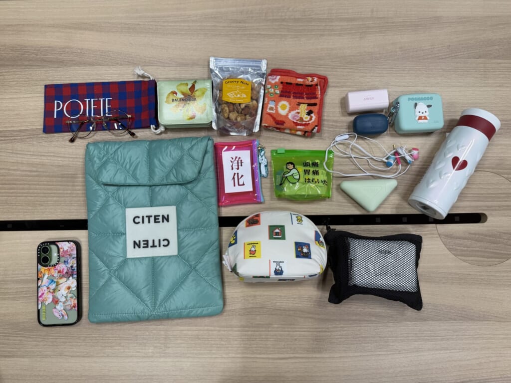 カバンの中身をずらりと並べてみると、たしかに色味などテイストが統一されています。ポーチの中身も並べてくれました。