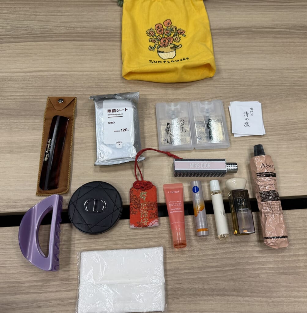 Oさん:これは、なんでも入れる巾着です。すぐ取り出したいものをここにまとめています。練り香水やスプレーなど香りのついているものは、気持ちを切り替えたり、リフレッシュしたいときに使います。リップクリームが2本あるのは、保湿対策を強化しているからです。最近、すごく乾燥しているので!