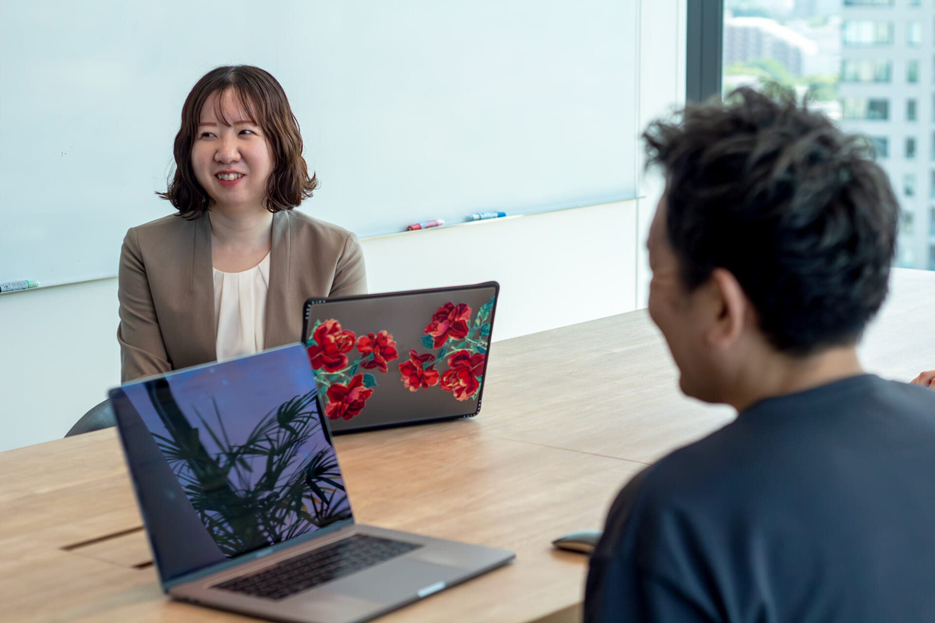 4月に新年度の幕開けとなるやいなや、あっという間にゴールデンウィークも過ぎ去り、夏ももう目前、という時期です。2025年卒の新卒新入社員が入社して約1か月半。入社日から数日の社内研修ののち、外部の研修に入ります。外部研修の期間は事業部によって異なり、開発事業部では約3か月となっていますが、クリエイティブ事業部は約1か月半。まさにこの対談の実施日に研修を終え事業部へと正式配属になり、先輩社員の指導のもと、実務に当たります。