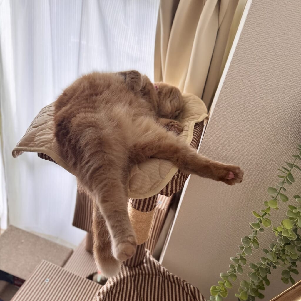 うちの猫の「体調の変化を少しでも早く気づけたらいいな」と思ったのがきっかけです。 いつも、こんな感じでキャットタワーで寛いでいます(=^・^=)
