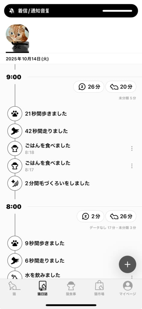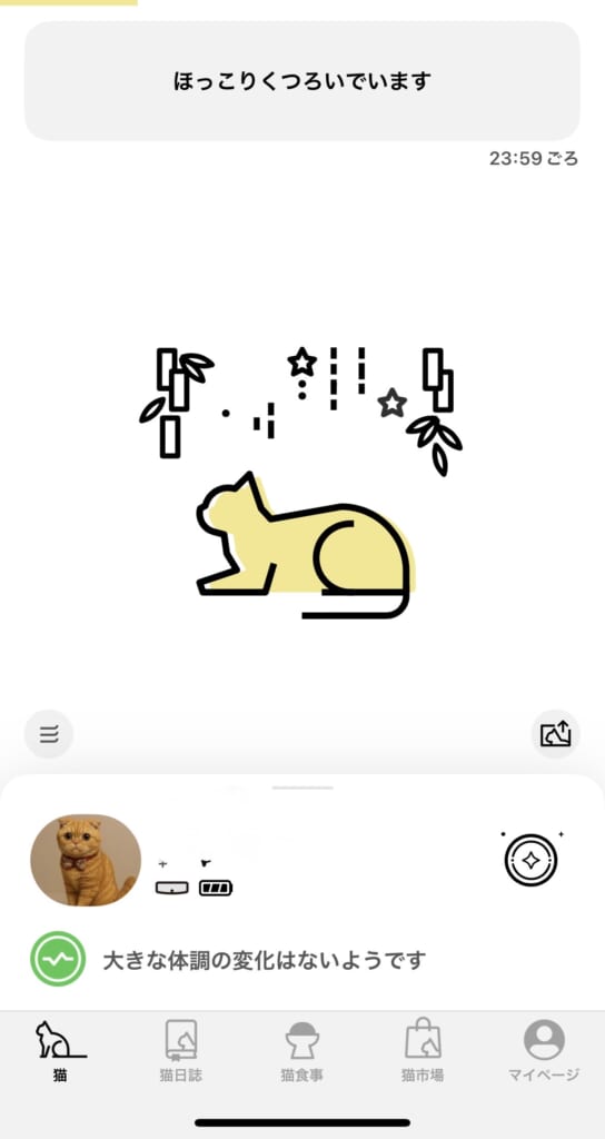 アプリを開くと、「今はお昼寝中」「歩いています」「くつろいでいます」など、