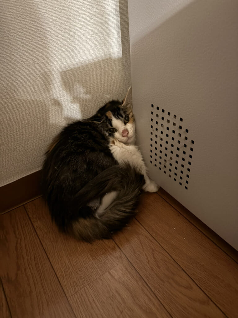 最初の1週間は家具の裏に隠れて全く出てこないほど警戒していましたが、10日ほど経つと少しずつ探検を始め、いまでは家中を自由に歩き回るようになりました。