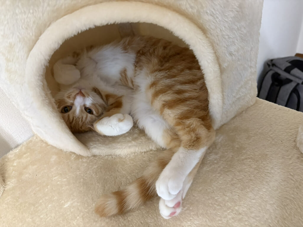 まだ子猫なので、電源コードや高い家具にも登ろうとするなど、危険な行動も多く、目が離せません。