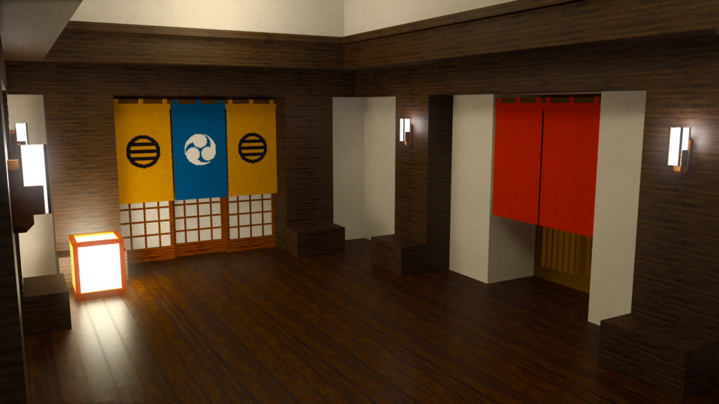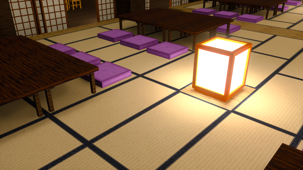 畳、各行灯、座布団など…和風な雰囲気になっています。こちらは「和風な館を舞台にした鬼ごっこ」をテーマにしたミニゲームで使用していたものです。我ながらよくできていると思います;)