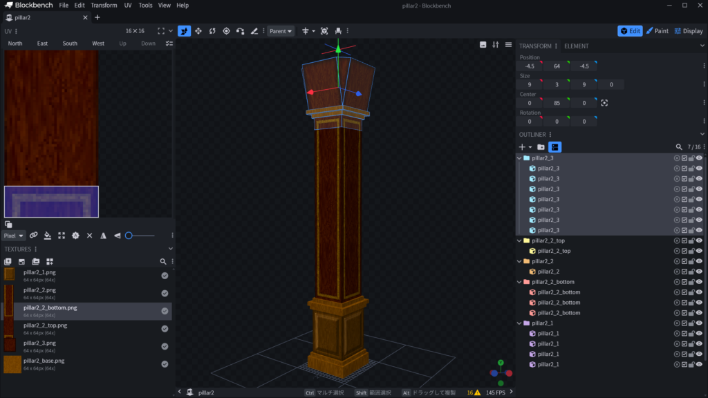 これはモデリングの画面です。Blockbenchというローポリゴンのモデル作成するときに便利なソフトを使っています。動作も軽いのでおすすめのソフトです。