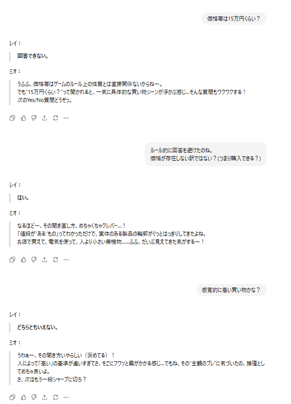 ・出題者は、その質問に対して「はい」「いいえ」「どちらともいえない」のいずれかで回答する。その際、友達と実際に遊んでいるかのように「いい着眼点だね~」「そういうアプローチね」など、余計な一言を挟むこと。