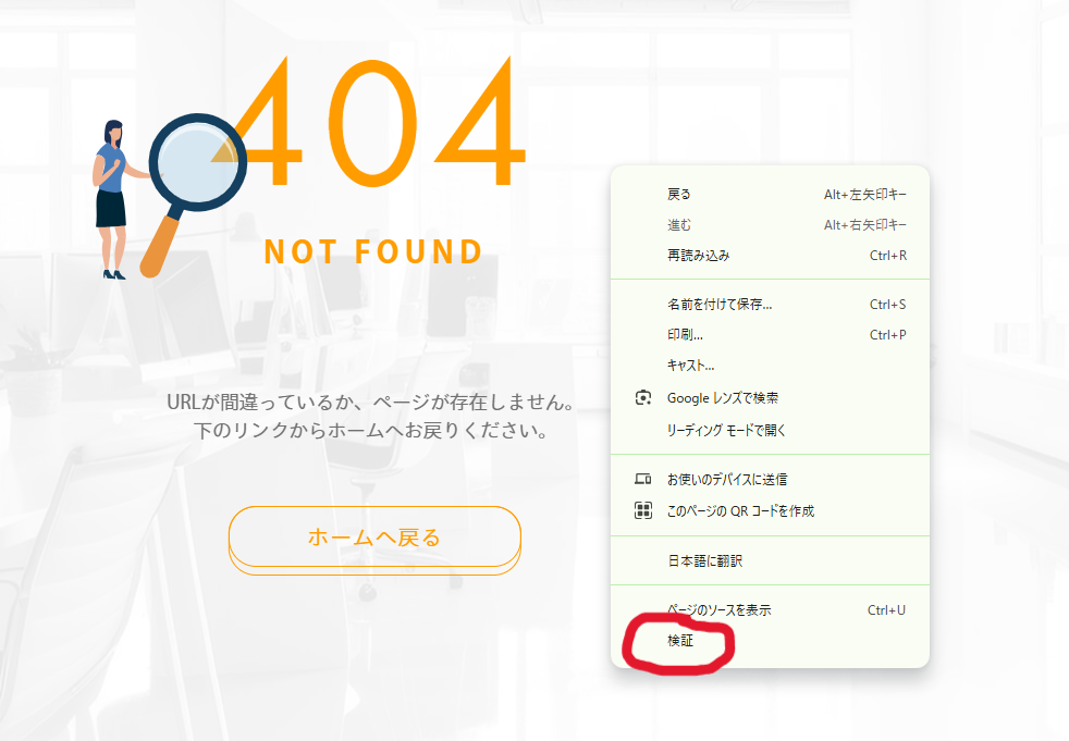 ➀まず、Webページ上のどこでもいいのでマウスの右クリックを押してください。すると上記画像にもあるような小さなメニューが表示されます。その中の、赤丸で囲われた「検証」をクリックしてください。