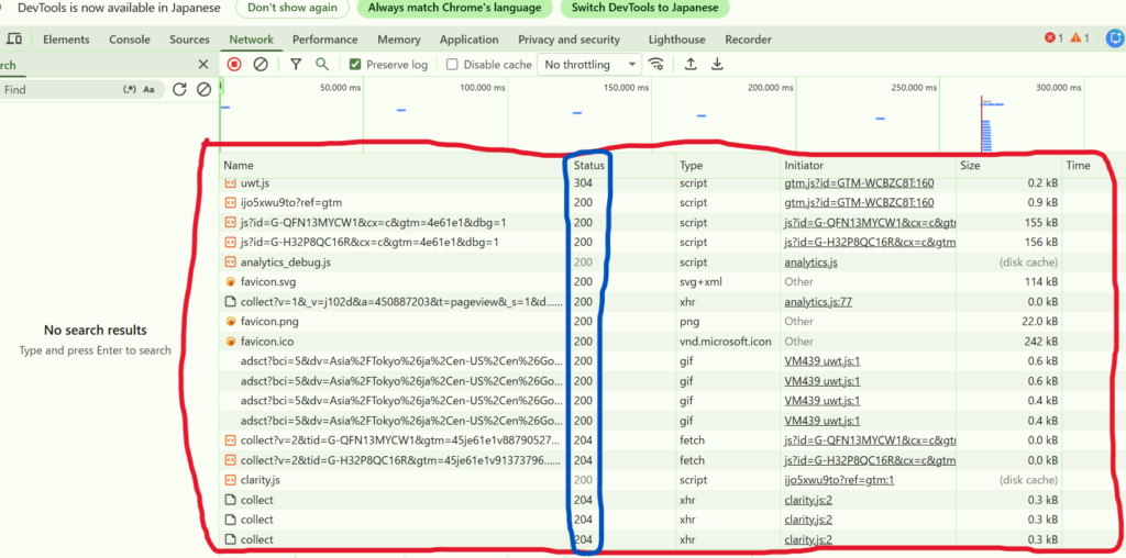 ③そのページ内にて、何か別ページを開くリンクをクリックしてみてください。すると、赤枠の中が増えていき、それぞれにステータスコードが割り振られているかと思います。