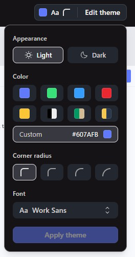 さらに、表示されている画面には「Edit theme」という機能があり、再度入力しなくても「カラー」や「フォント」などのスタイルを自由に変更できた。