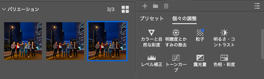 「調和」生成結果も3パターン出力されて、色調関連の微調整も可能です。