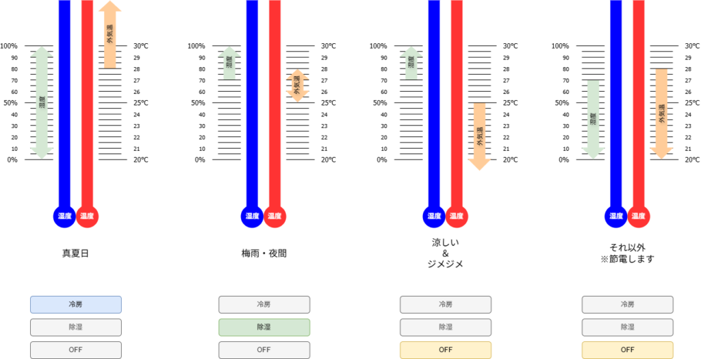 蒸し暑い梅雨時や夜間(25~28℃、湿度70%以上)