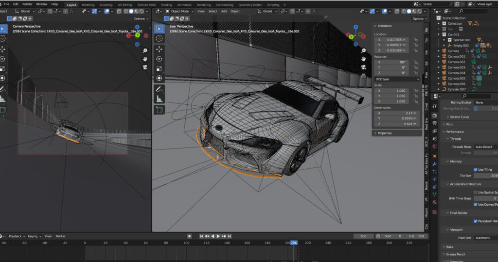 まずは車のモデリングです。3DソフトのBlenderを使用して、車の三面図を見ながらモデリングを進めていきます