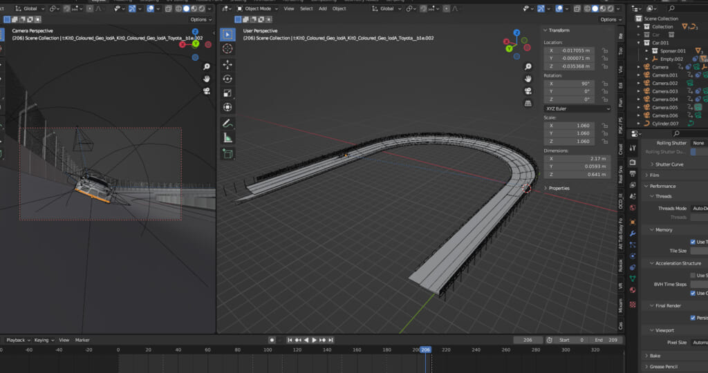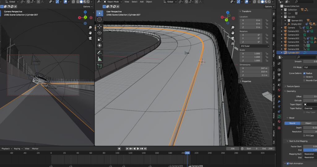 車のモデリングに時間がかかった分、コースに関しては簡略化して雰囲気だけそれっぽくモデリングする事にしました。コースの形状はオーバルコース(楕円形のような形状)に設定してコースの半分だけをモデリング。