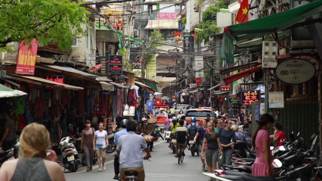 かつて存在していたタンロン城跡や、お店の目の前を電車が通り抜けるトレインストリート、そして多くの商店が立ち並んでおり、いつ訪れても海外からの観光客で賑わっています。
