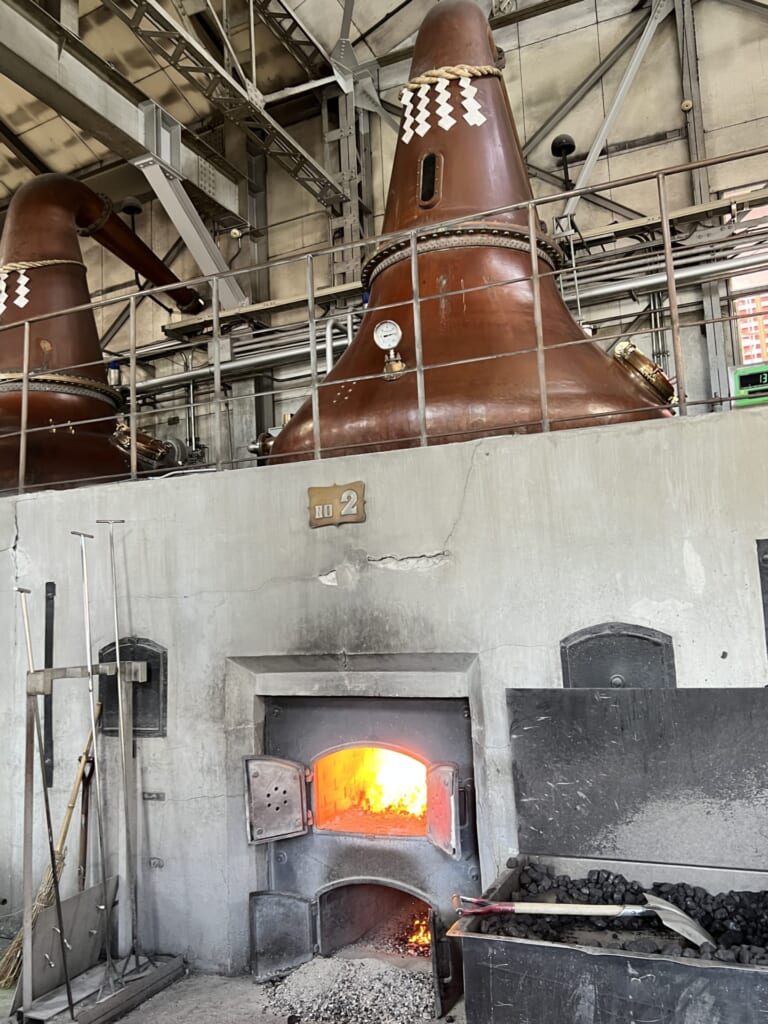 この形の蒸留機は世界でもここでしか使っていない石炭直火蒸留方式を採用している。この蒸留方式によって”余市らしさ”の一端が生成される重要な工程である。温度管理は人間の手で行いわないといけないため職人技である。